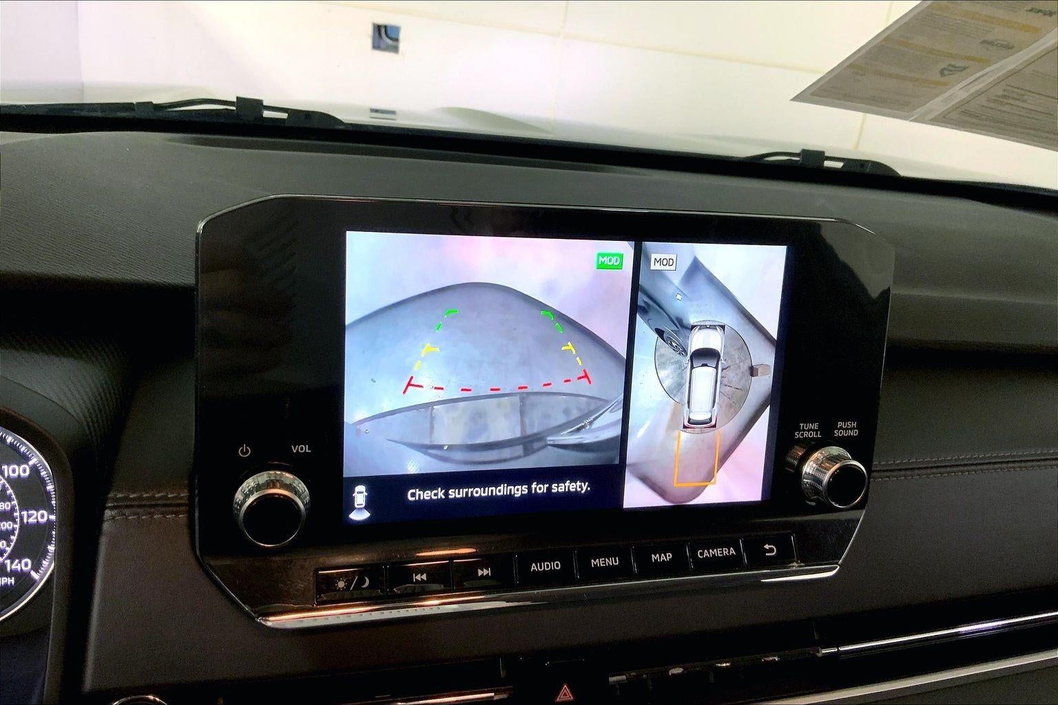 - The vehicle is equipped with a camera that displays an image of the area behind the vehicle on an interior display.