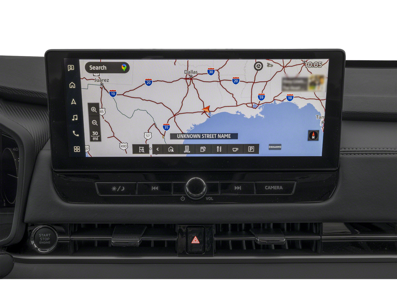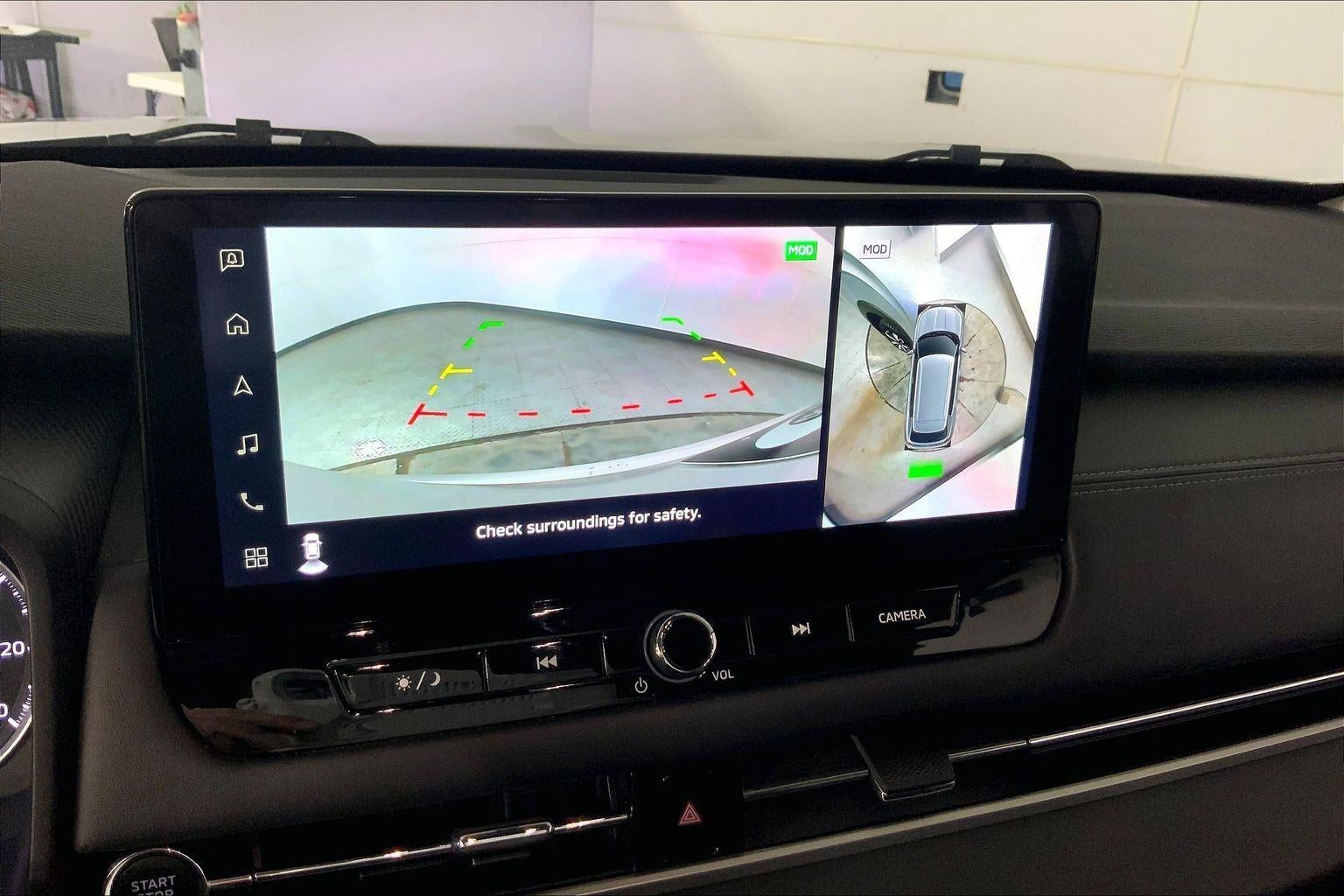 - The vehicle is equipped with a camera that displays an image of the area behind the vehicle on an interior display.